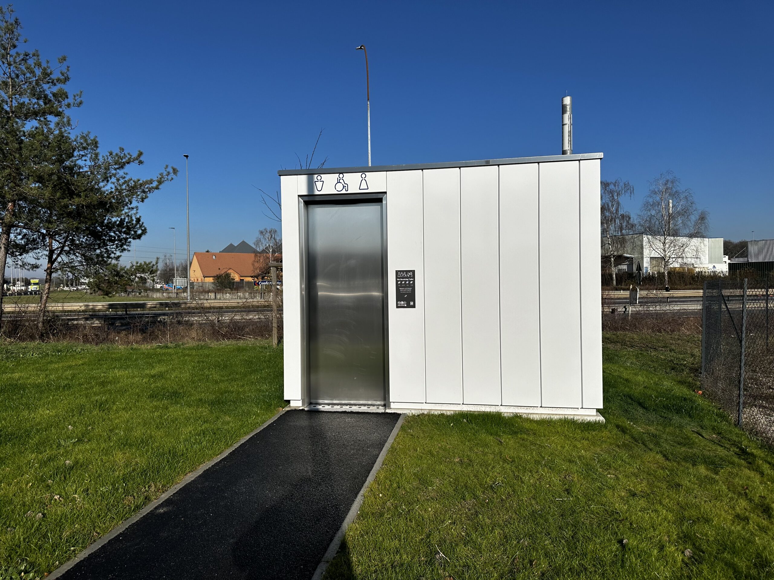 Along the highway near Orléans, there has been an Ionity mobility hub since June 2023, featuring 6 charging stations and a parking area used, among others, by BlaBlaCar. At this location, you'll find our wheelchair-accessible, Stand-Alone, with powder-coated white panels, and a 'The Revolving Toilet' system. The distinctive white exterior ensures that this Stand-Alone seamlessly blends into Ionity's color palette.